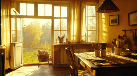 A beautifully lit kitchen scene showcasing warm sunlight filtering through large windows, creating a serene atmosphere with a view of autumn foliage outside.