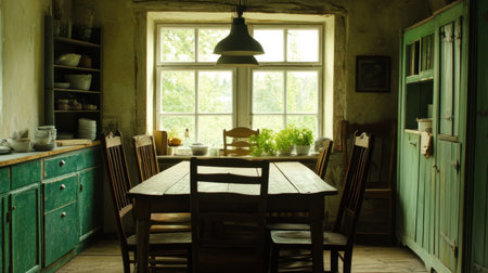 A cozy rustic kitchen featuring a wooden dining table surrounded by vintage chairs, with soft natural light streaming through large windows, creating a warm, inviting atmosphere.