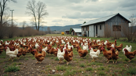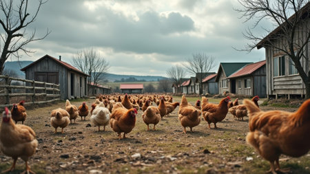 Flock of chickens roaming on rural farm under overcast sky. That the image is generated using AI.