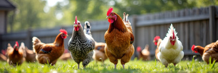 Colorful rooster and hen flock in lush green backyard with sunlit environment. That the image is generated using AI.