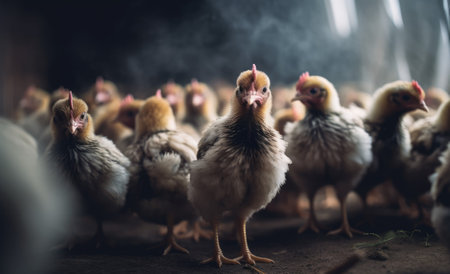 Group of brown chickens in a rustic coop with soft natural lighting. That the image is generated using AI.