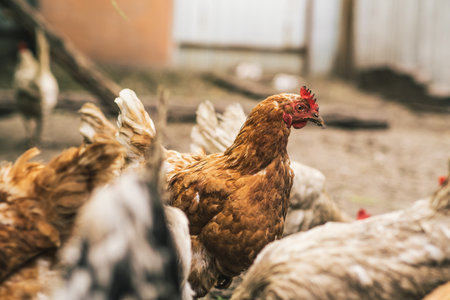 Pets. Brown chickens are foraging on the ground in a sunlit farmyard, surrounded by other hens, capturing the essence of rural life and natural behavior