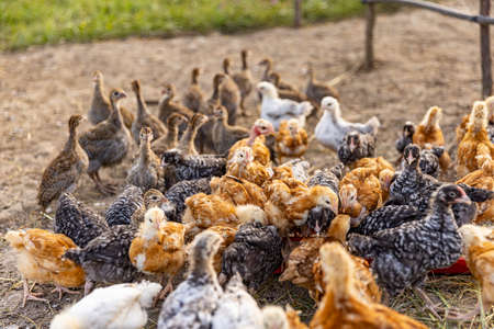 Free range chickens on a traditional poultry farm. Agriculture nature farm concept.
