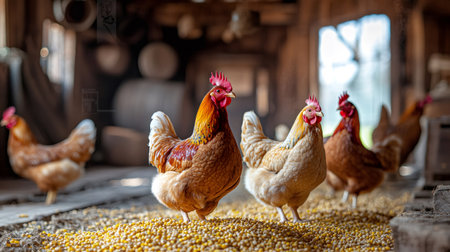 Chickens Feeding on Grain Inside a Rustic Chicken Coop