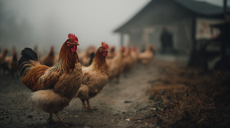 A charming close-up of brown chickens wandering the farmyard, surrounded by a soft fog, showcasing their natural behavior in a rustic setting.