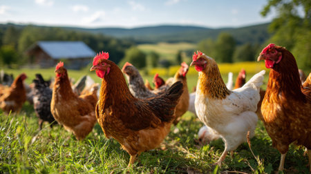 Chickens of various colors roam freely across a vibrant green field on a sunny day. In the distance, a rustic barn and rolling hills create a peaceful farm scene.