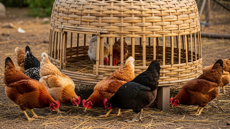 A flock of brown and black chickens feeds on grain around and inside a large traditional bamboo woven cage. The scene depicts rural poultry farming and free-range livestock management.