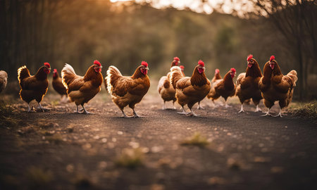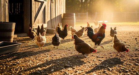 Chickens roaming in farmyard at sunrise with warm sunlight and farm buildings. That the image is generated using AI.