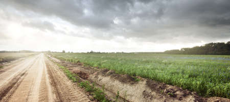 An empty country road through the fields after the rain. Dramatic sky, epic cloudscape. Fickle weather. Latvia. Cyclone, storm, meteorology, ecology, climate change, natural phenomenon