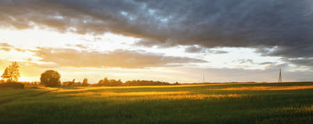 Beautiful landscape at sunset green rye and trees on the horizon.