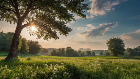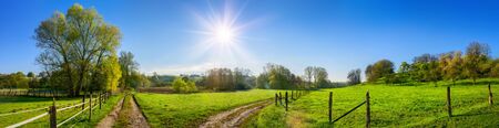 Rural panoramic landscape in friendly happy colors, with the sun shining in the clear blue sky and dirt roads leading through vibrant green meadows