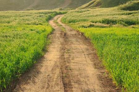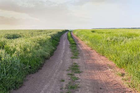 Dirt road through the fields with grain, evening view