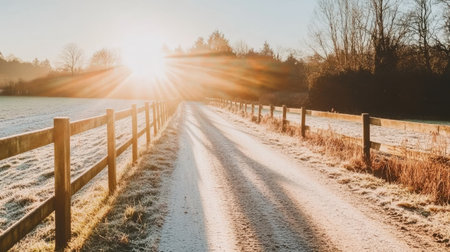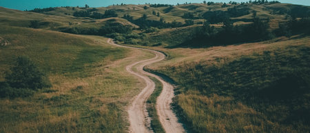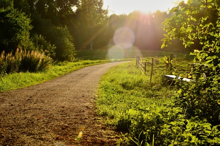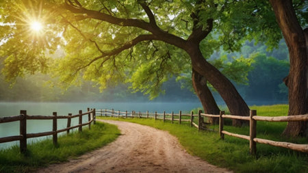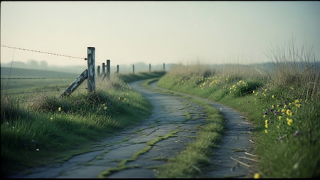 Morning sunlight illuminating a winding unpaved path through rolling green countryside hills and fields with old wooden fence posts