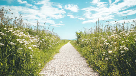 A picturesque gravel pathway leads through vibrant wildflowers and lush grass, inviting peaceful strolls under a bright blue sky filled with soft clouds.