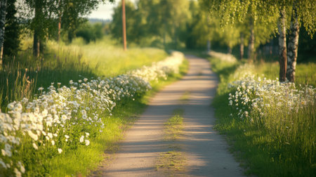 This beautiful image captures a tranquil pathway lined with white flowers and lush green trees, inviting viewers to experience nature's serenity and beauty.