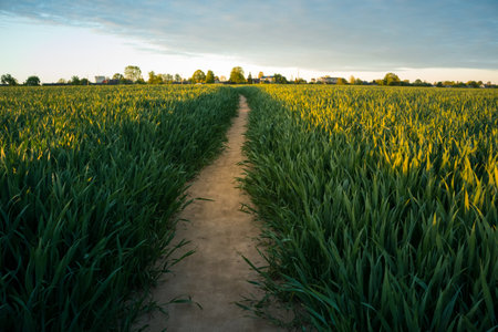 Narrow dirt road between the fields of green ripening wheat and barley against the sky