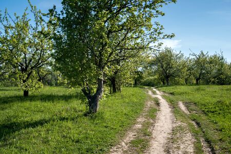 A beautiful springtime landscape with a gravel road. Dirt road in Northern Europe.