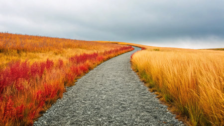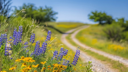 Winding path through flowerfilled hills