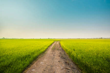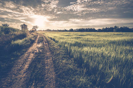 Dirt road with tire tracks in the rice field at sunset, countryside of Thailand