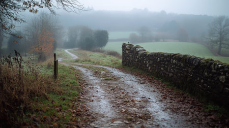 A quiet country road traverses a foggy landscape with a stone wall lining the path and trees barely visible in the distance.