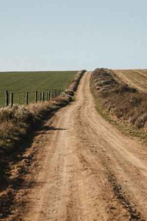 A stunning view of a gravel pathway meandering through the countryside, flanked by a wooden fence under a radiant blue sky, perfect for nature lovers.