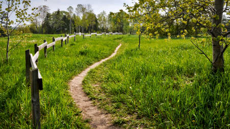 The winding trail in the park with the fence in springtime