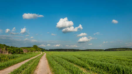 summer rural landscape. the field sandy road along bushes to the wood under the blue cloudy sky