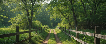 AI Generated. Wooden Fence Path Through Lush Green Summer Woods