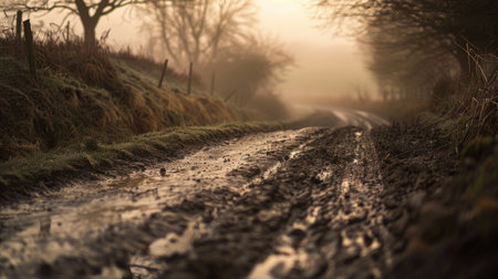 Scenic mudy dirt road in the fields in misty morning light