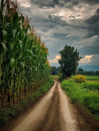 Cornfield and driveway to a farm in rural Agricultural field on which the green corn grows : Generative AI