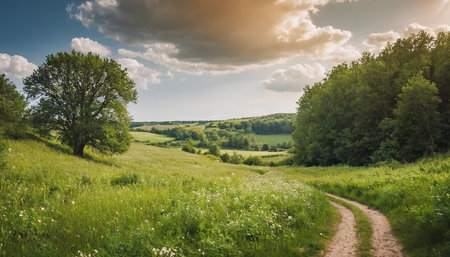 A winding dirt path leads through vibrant green fields dotted with wildflowers as the sun sets casting a warm glow over the serene countryside landscape.