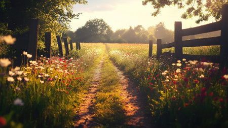 A beautiful dirt pathway surrounded by colorful wildflowers leads through a tranquil meadow at sunrise, showcasing nature's serene beauty and peaceful ambiance.