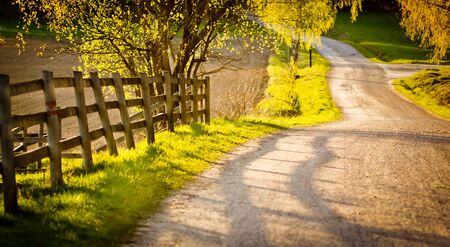 village road near the wooden fence at the sunset