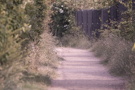 path surrounded by golden wheatgrass plant outdoor in sunny meadow shot at shallow depth of field