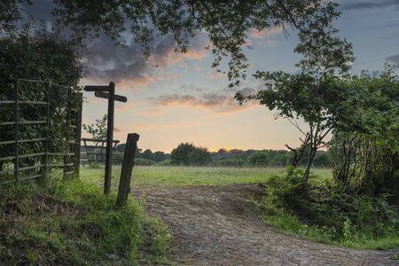 Beautiful English countryside Summer sunset landscape image with footpath signposted through warm field