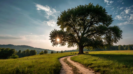 Beautiful summer landscape with a big tree and a dirt road.