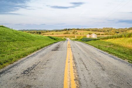 A winding asphalt road stretches through countryside fields under a misty horizon at sunrise inviting exploration and adventure.
