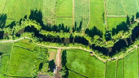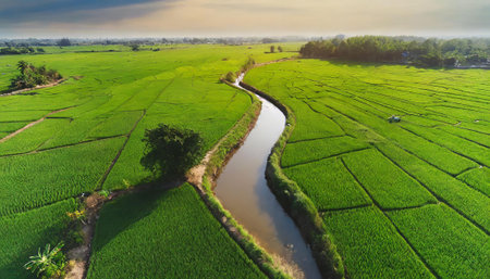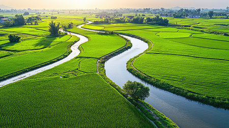 A stunning aerial view of lush green rice fields, curving gracefully around a winding river under a soft morning light. Perfect for showcasing agricultural beauty.