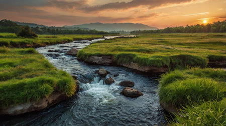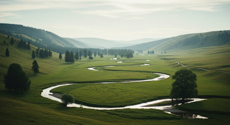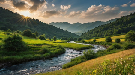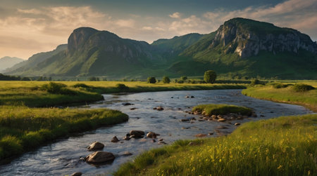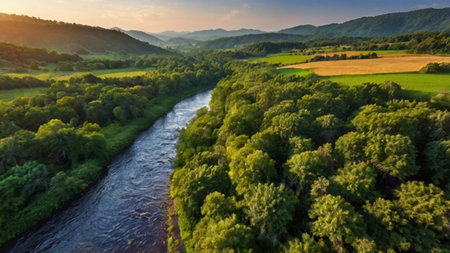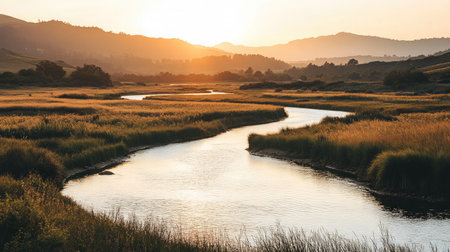 A river winds through a valley, reflecting the warm hues of the sunrise or sunset. The scene features dense greenery, including trees and grass, under a soft, diffused light. The composition highlights the natural beauty of the environment, suitable for various commercial and editorial applications.