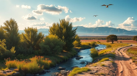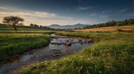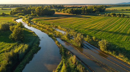 AI Generated. Tranquil Rural Landscape with Waterway and Lush Green Fields at Sunset