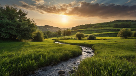 Serene landscape featuring a winding river flowing through rolling green hills, bathed in the warm glow of sunset, with a cozy farmhouse nestled amidst the idyllic scenery