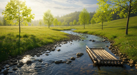 Gentle stream cascades through a sun-drenched forest, creating a tranquil scene. Rocks peek out from the flowing water, reflecting the surrounding verdant landscape.