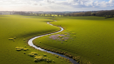 An aerial view of a lush green countryside with a winding river, dotted with yellow daffodils and purple crocuses blooming in the spring sunlight.