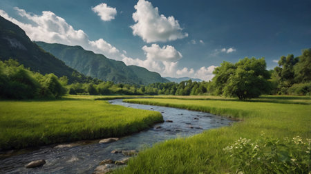 A captivating scene of a winding river flowing through a vibrant green valley, framed by majestic mountains. This tranquil landscape evokes a sense of peace and natural beauty.