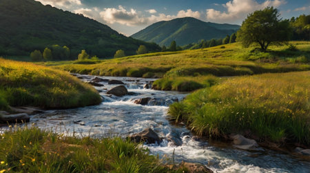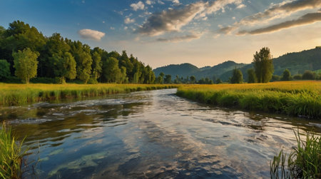 Beautiful summer landscape with mountain river and meadow at sunset.