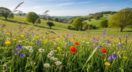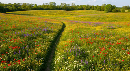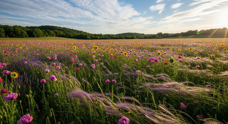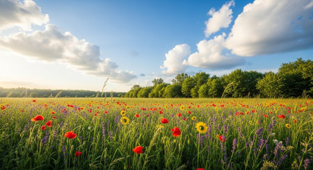 Colorful wildflowers bloom in a sunny meadow, surrounded by lush green grass and trees.