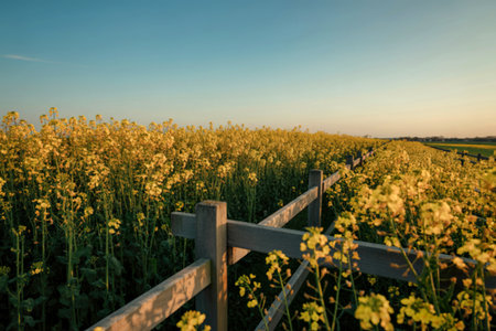 Rapeseed field at sunset. Calm landscape of blooming rapeseed.