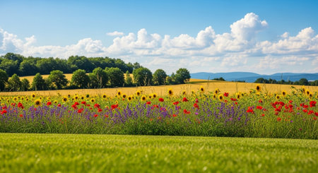 Idyllic summer meadow with flowers sunflowers and blue sky