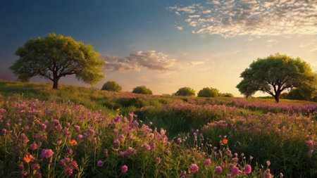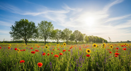 Idyllic Summer Meadow with Flowers and Trees under Sunshine