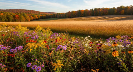 Colorful meadow with wildflowers at sunset. Autumn landscape.